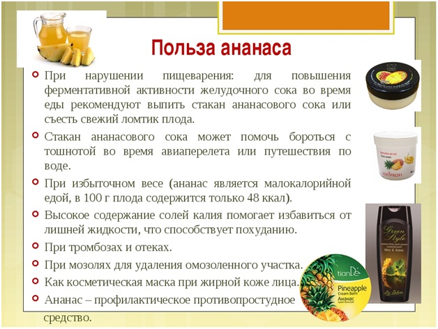 Английские ученые также доказали, что бромелайн оказывает положительное действие на зачатие. Так как у женщин принимающих экстракт ананаса наблюдалось улучшение репродуктивной функции и снижение лишнего веса.
