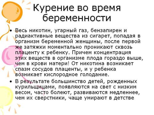 - Спазм сосудов курящей матери вызывает гипоксию (кислородное голодание) плода.