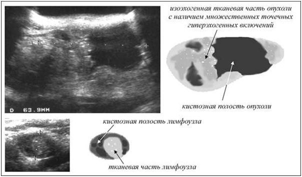 Если природа включения является злокачественной, то по мере прогрессирования процесса (увеличения опухолевого образования), проявляется такая симптоматика, как наличие в очаге анэхогенных, гипоэхогенных или гиперэхогенных образований.