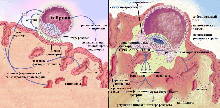 | Имплантация | Полное погружение бластоцисты в эндометрий. | Гормоны (прогестерон, эстроген), факторы роста, цитокины, внеклеточный матрикс эндометрия. |