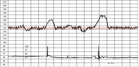 Норма в состоянии покоя – 110-160 ударов в минуту, норма во время движения плода – 130-190 ударов в минуту. Вариабельность ритма (отклонения от среднего показателя ЧСС). Норма – 5-25 ударов в минуту. Децелерация (замедление частоты сокращений сердца при движениях или схватках на 15 и более секунд).